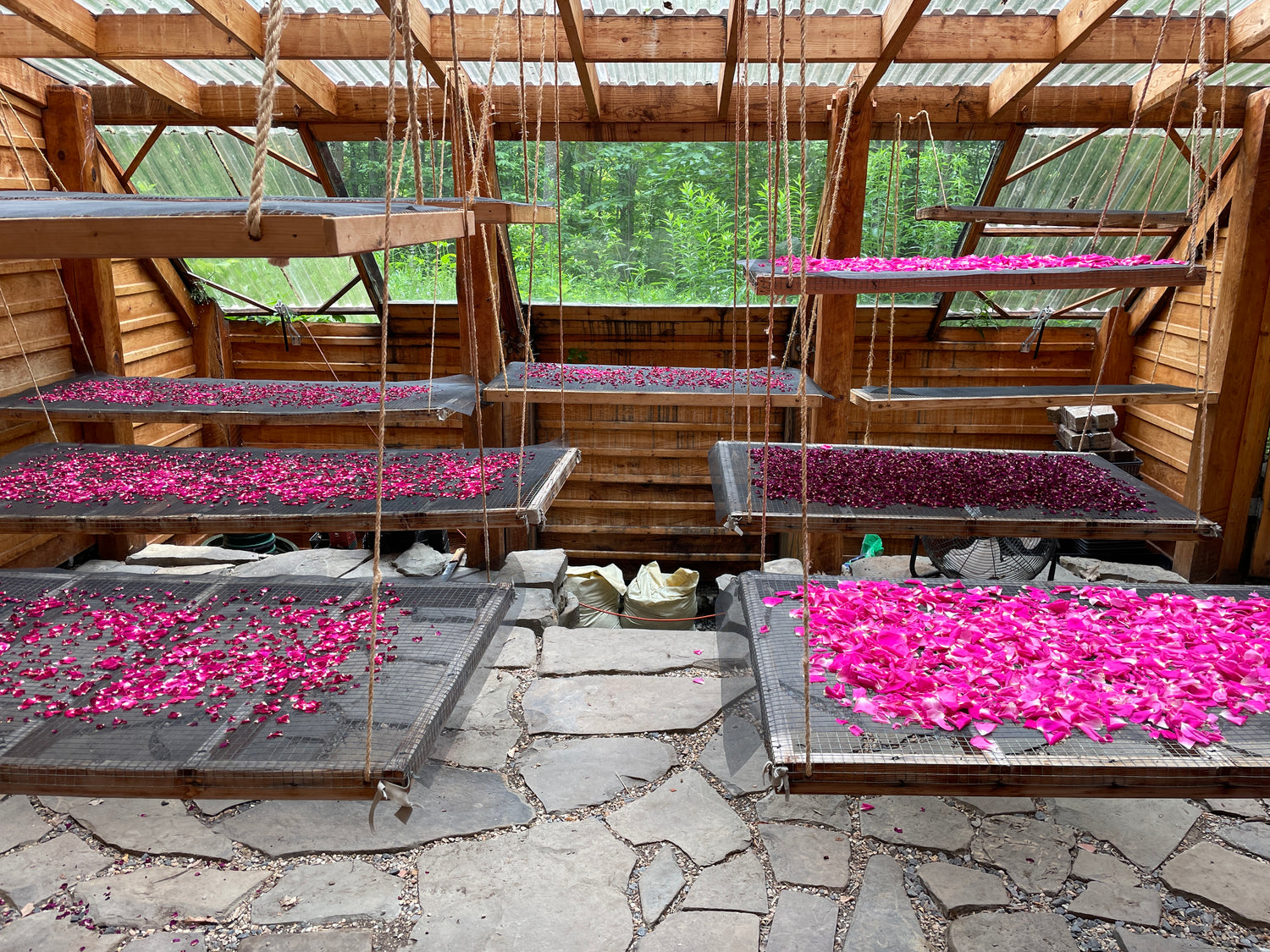 Our earth sheltered greenhouse cradles our seedlings in the spring and dries our harvests for our herbal tea blends in the summer.